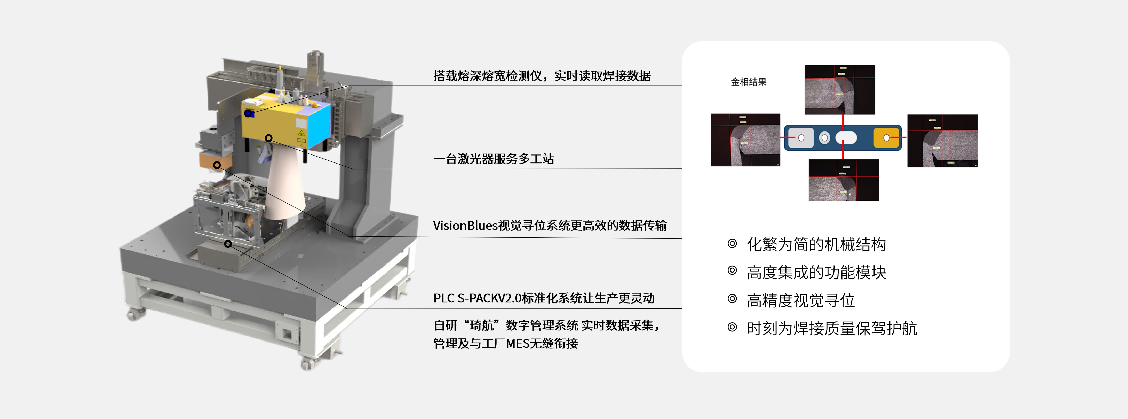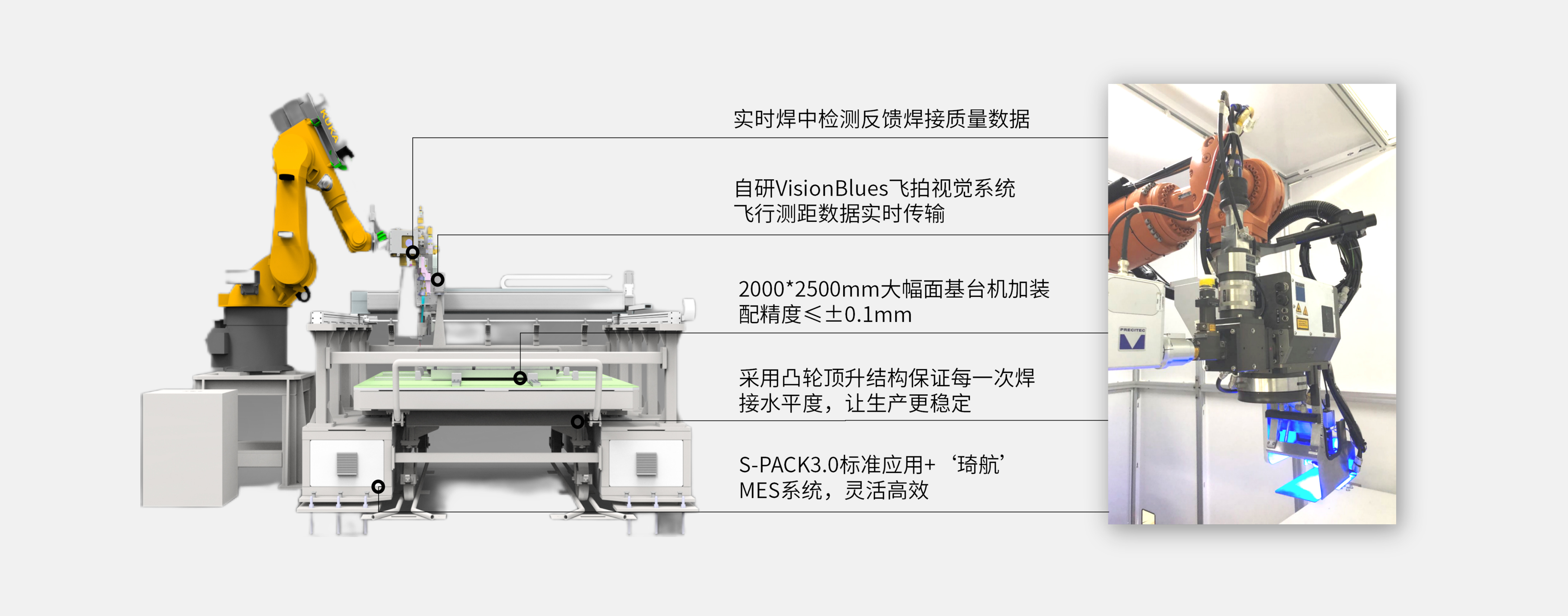 该产品是针对新能源锂电池 CTP 焊接场景设计的集成化工作站,融合 CCD、视觉识别、焊中检测、飞行焊接、MES 系统等多项技术,搭载 2000*2500mm 大幅面基台机,采用凸轮顶升结构保障焊接水平度,可实现焊接过程的实时数据监控与高效生产,核心目标是达成 20JPH 的高质高效生产需求。
